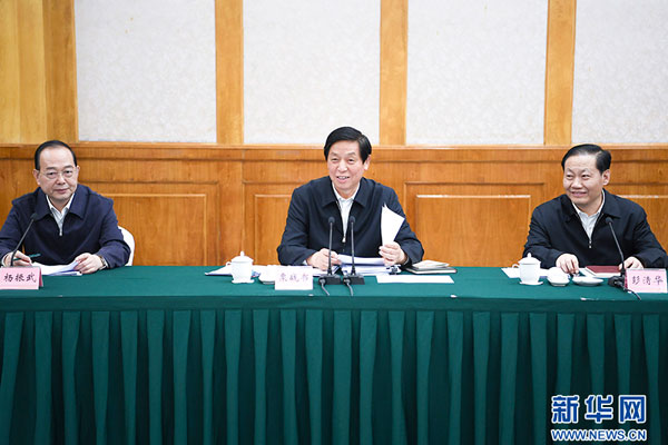 4月8日至11日,中共中央政治局常委、全国人大常委会委员长栗战书率领全国人大常委会执法检查组在四川检查水污染防治法实施情况。这是4月10日,栗战书在省人大常委会机关主持会议同地方人大负责同志和部分全国人大代表、地方各级人大代表座谈。 新华社记者 燕雁 摄