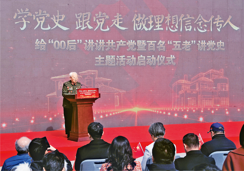 2021年2月23日,“学党史 跟党走 做理想信念传人——给‘00后’讲讲共产党暨百名‘五老’讲党史主题活动”在位于上海市嘉定区的外冈游击队纪念馆正式启动。本次活动拉开了上海教育系统党史学习教育的序幕,将组织包括新四军老战士在内的一批老干部、老战士、老专家、老教师、老模范走进校园,以“校外辅导员”的方式,参与大学和中小学的思想政治教育,教育引导青少年始终听党的话、永远跟党走。图为上海市新四军历史研究会名誉会长、九旬新四军老战士阮武昌在活动现场讲述新四军的抗日故事。 新华社记者 刘颖/摄