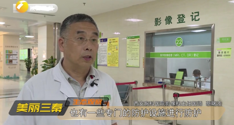 西安胸科医院影像科主任医师蔡曙波:医院成立了相关的辐射防护小组,包括我们设备安装的时候进行了环评控评,人员这方面来说呢,我们在扫描方式上采取低剂量、大螺距的扫描,可以大幅度减低这种辐射的损害,其次,我们在扫描过程中,对病人的一些敏感部位,也有一些专门的防护设施,最大程度地减少患者接触不必要的辐射损害。