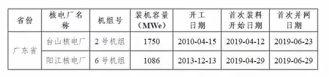 表1 2019年1-9月首次装料的核电机组信息