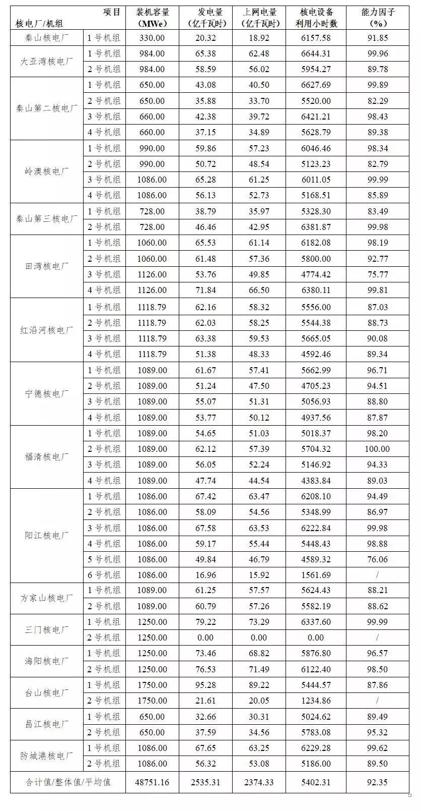 3、对于本表最后一行的“合计值/整体值/平均值”,装机容量、发电量、上网电量为各机组合计值,核电设备利用小时数为全部机组整体值,能力因子为全部机组的算数平均值。