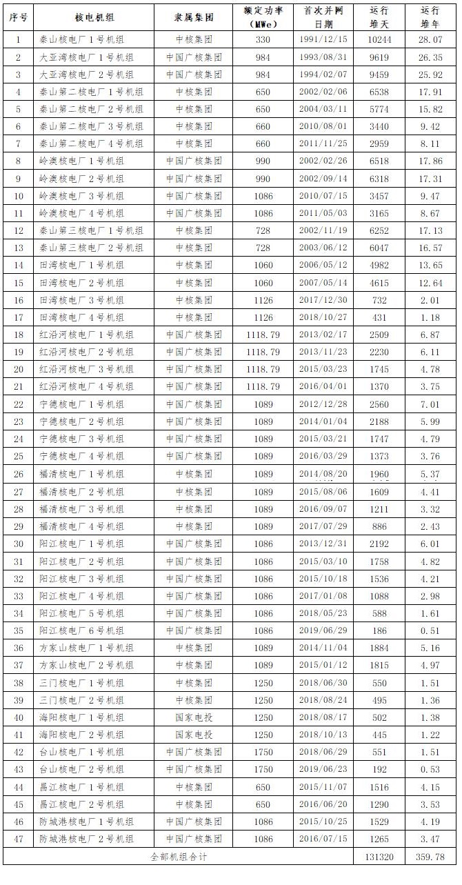 根据中国核能行业协会核电营运信息网(CINNO网)统计,我国共有运行核电机组47台(不含台湾地区),截至2019年12月31日,机组安全运行360(359.78)堆年,详情见下表。