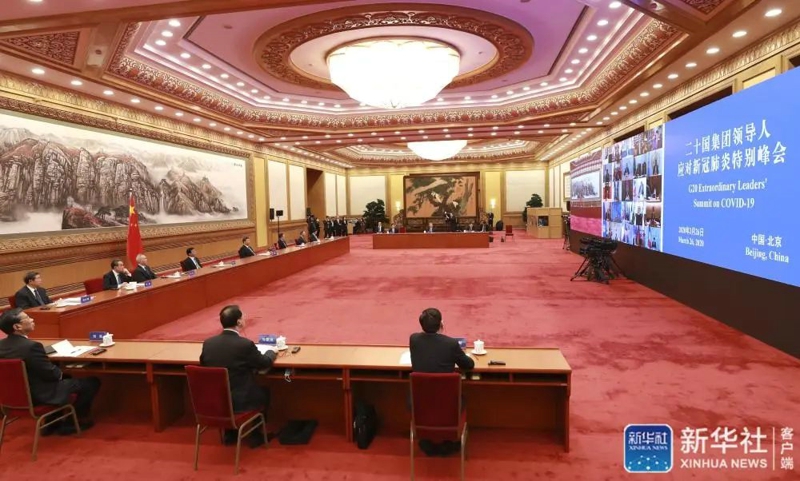 3月26日,国家主席习近平在北京出席二十国集团领导人应对新冠肺炎特别峰会并发表题为《携手抗疫 共克时艰》的重要讲话。新华社记者 李学仁 摄