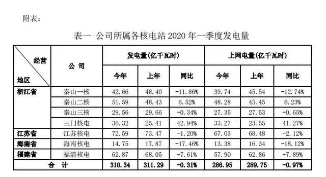因受新冠肺炎疫情影响,核电机组参与电网调停或降负荷时间多于去年。一季度核电发电量为310.34千瓦时,比去年同期微降约0.31%;上网电量286.95亿千瓦时,同比下降约0.97%。 其中: 秦山一核一季度发电量同比减少11.86%,主要原因系受疫情影响。 秦山二核一季度发电量同比增加6.52%,主要原因为虽受疫情影响,但去年同期有1台机组在当季执行大修,而今年无大修安排,因此发电量同比有所增加。 秦山三核一季度发电量同比基本持平,主要原因是疫情影响较小。 江苏核电一季度发电量同比微降1.20%,主要原因为疫情影响。 三门核电一季度发电量同比大幅增加42.94%,主要原因为去年同期2号机 组正在进行停堆小修,今年2号机组正常安全稳定运行。 海南核电一季度发电量同比减少17.46%,主要原因为两台机组均在本季度执行了大修,同时叠加疫情影响。 福清核电一季度发电量同比减少7.61%,主要原因为与去年相比,今年第一季度增多一台机组大修,同时叠加疫情影响,详情如下: