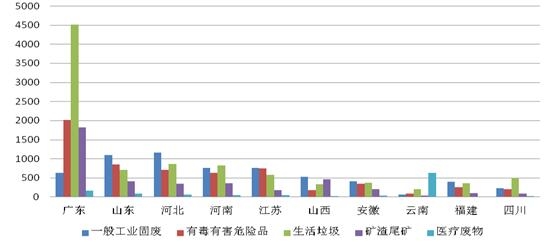 2019年全国固废污染举报中,生活垃圾占36.4%,一般工业固废占23.6%,危险废物占23.2%,矿渣尾矿占13.7%,医疗废物占4.2%。广东固废污染相对突出,举报量占全国固废举报总量的26.8%,其中生活垃圾举报占一半。