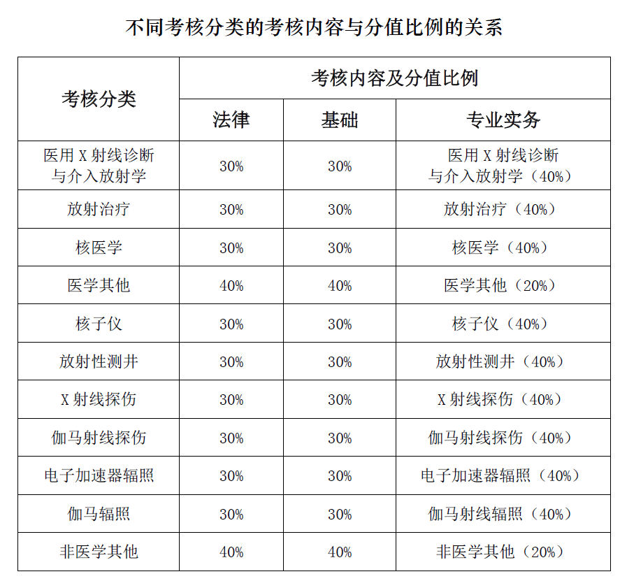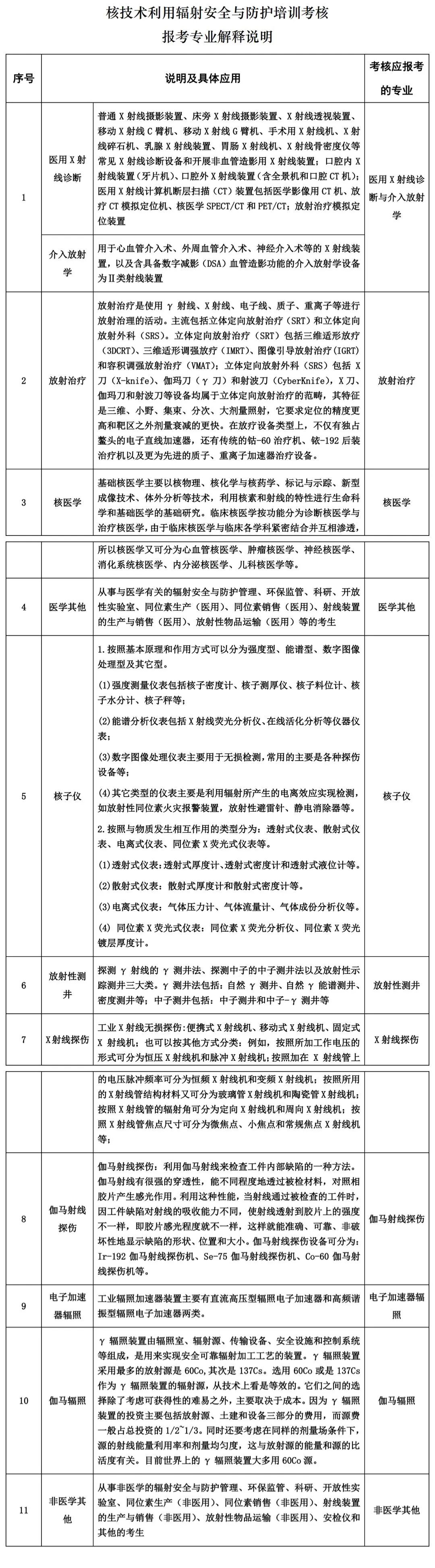 (2)核技术利用辐射安全与防护考核为闭卷考核,考核时长为60分钟。考核科目分为医学(医用X射线诊断与介入放射学、放射治疗、核医学,并设医学其他)和非医学(X射线探伤、伽马射线探伤、电子加速器辐照、伽马射线辐照、核子仪、放射性测井,并设非医学其他),合计十一类。