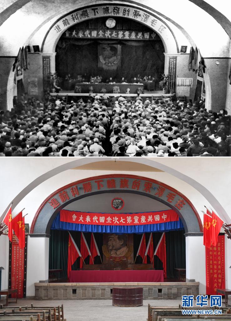 拼版照片:上图为中国共产党第七次全国代表大会会场(资料照片,新华社发);下图为2021年3月31日拍摄的位于延安市杨家岭革命旧址的中国共产党第七次全国代表大会会场(新华社记者张博文摄)。新华社发