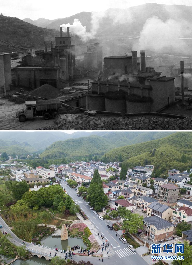 拼版照片:上图为浙江省湖州市安吉县天荒坪镇余村上世纪八十年代的资料照片;下图为2018年4月24日,游客在整修一新的余村游览拍照(新华社记者翁忻旸摄)。新华社发