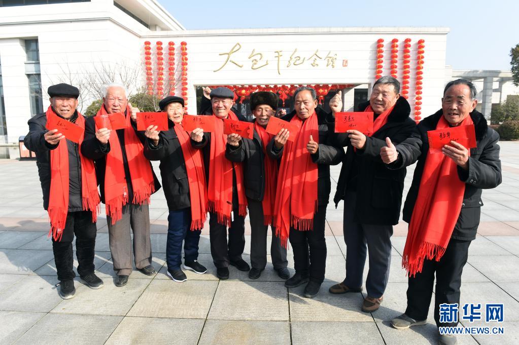 2月3日,在安徽省滁州市凤阳县小岗村,8位“大包干”带头人在大包干纪念馆前展示自家领取的集体经济收益股权分红。新华社记者 周牧 摄