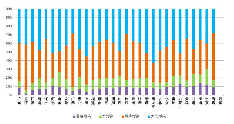 从各省举报污染类型占比来看,黑龙江大气污染举报在当地占比较高,占比高于全国平均水平约20个百分点,主要反映烟粉尘污染问题。广西、重庆噪声污染举报在当地相对突出,占比高于全国平均水平约12个百分点,广西主要反映工业噪声污染问题,重庆主要反映建设施工噪声污染问题。宁夏、山东水污染举报在当地占比高于全国平均水平约8个百分点,主要反映生活污水和工业废水污染问题。