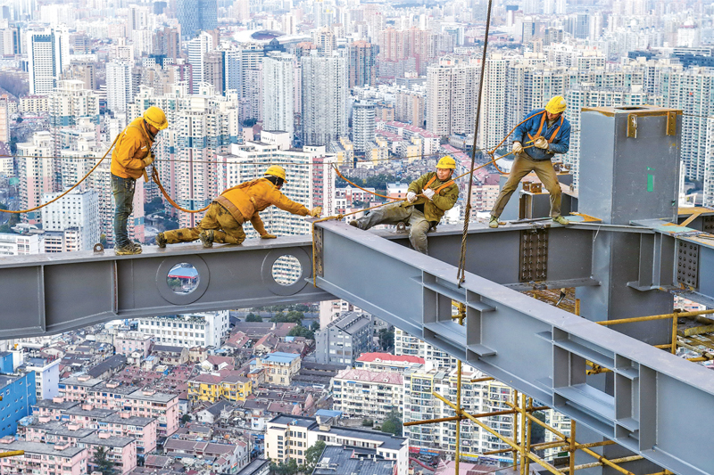 美好生活是劳动者的双手干出来的,劳动才能创造幸福。图为2017年1月15日,上海市虹口区提篮桥星港国际中心工地,4位建设者为确保钢梁就位,相互助力、互相配合,演绎了一曲现代版的劳动者之歌。 上海市工程设备监理有限公司 胡志民/摄