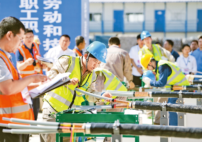 2019年8月27日,第三届京津冀职工职业技能大赛决赛在雄安新区雄安站举行,来自北京、天津和河北的数十名选手参加了瓷砖镶嵌和10千伏电缆剥切等项目的决赛。图为参赛队员在10千伏电缆剥切比赛中。 新华社记者 邢广利/摄