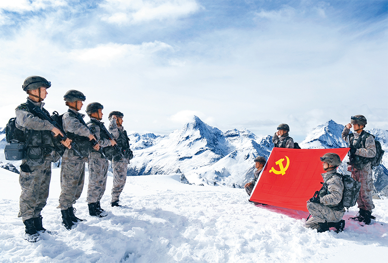 西藏山南军分区某边防团官兵对海拔5130米点位进行武装巡逻,在茫茫雪山开展重温入党誓词活动。 中央军委政治工作部供图 王美玉/摄