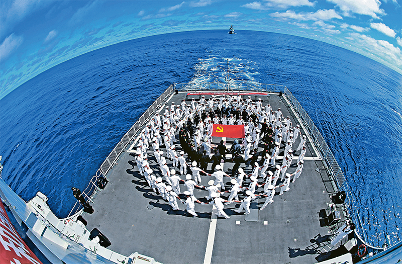 海军某舰艇编队在环球访问中开展“航行在世界,兵心永向党”活动,官兵同声歌唱《忠诚于党》。 中央军委政治工作部供图 代宗锋/摄