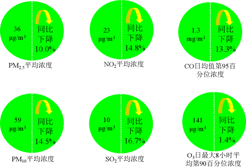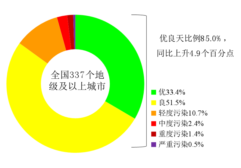 在环境空气方面,全国337个地级及以上城市平均优良天数比例为85.0%,同比上升4.9个百分点;PM2.5浓度为36微克/立方米,同比下降10.0%;PM10浓度为59微克/立方米,同比下降14.5%;O3浓度为141微克/立方米,同比下降1.4%;SO2浓度为10微克/立方米,同比下降16.7%。