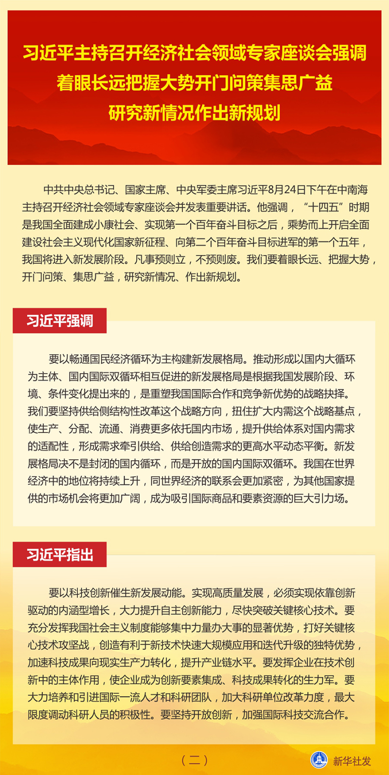 新华社北京8月24日电 中共中央总书记、国家主席、中央军委主席习近平8月24日下午在中南海主持召开经济社会领域专家座谈会并发表重要讲话。他强调,“十四五”时期是我国全面建成小康社会、实现第一个百年奋斗目标之后,乘势而上开启全面建设社会主义现代化国家新征程、向第二个百年奋斗目标进军的第一个五年,我国将进入新发展阶段。凡事预则立,不预则废。我们要着眼长远、把握大势,开门问策、集思广益,研究新情况、作出新规划。