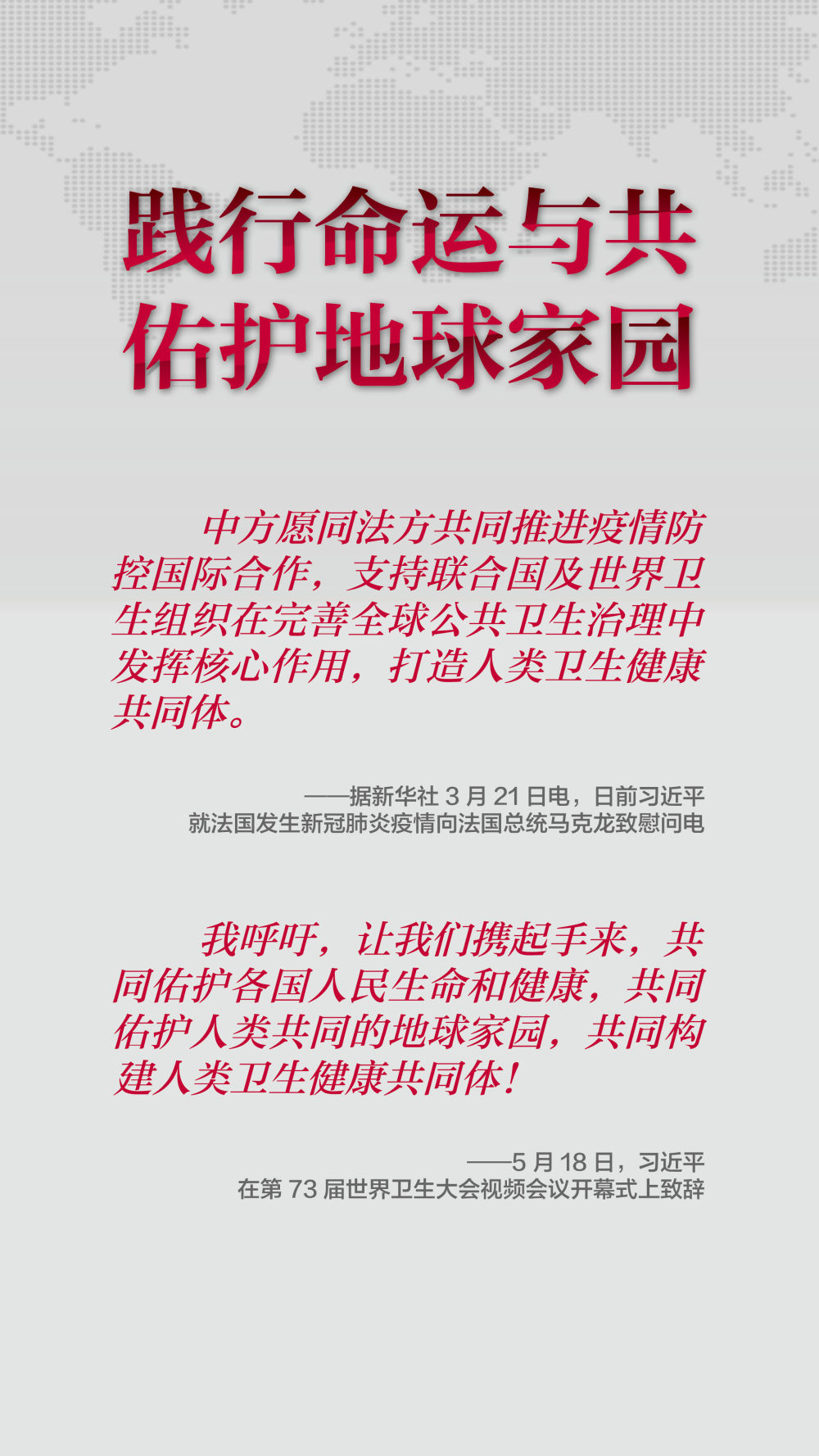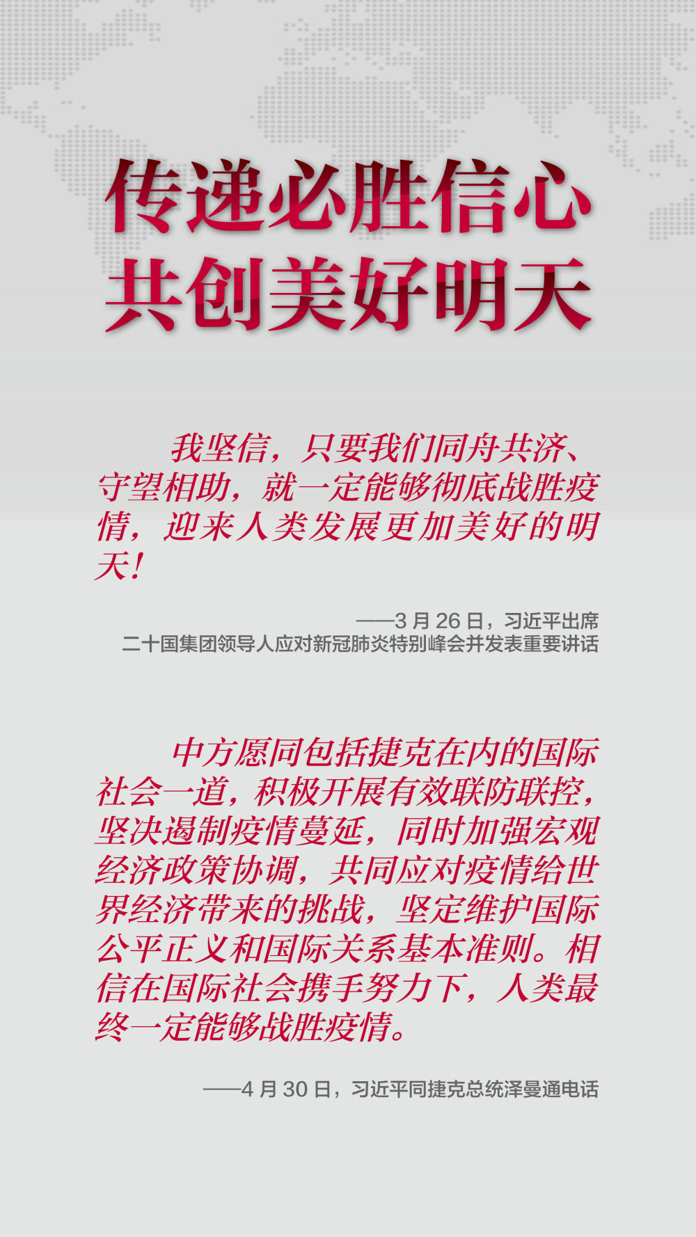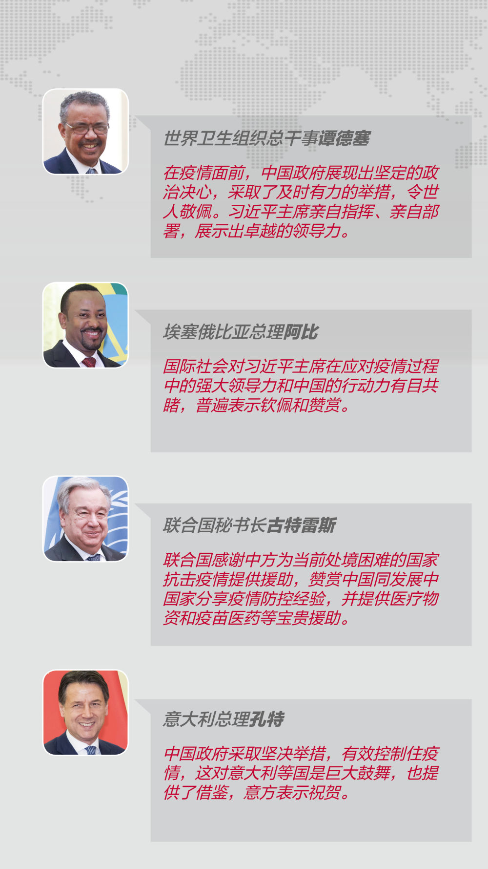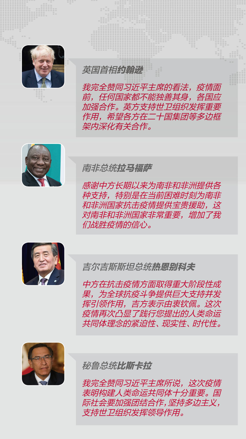 战“疫”以来,各国政要和国际组织负责人向习主席表达对中国抗击疫情举措的敬佩,对中国持续提供抗疫援助的感谢,对中国推动疫情防控国际合作的支持,对进一步深化友谊、扩大合作的积极意愿,以及对人类命运共同体理念的强烈共鸣。