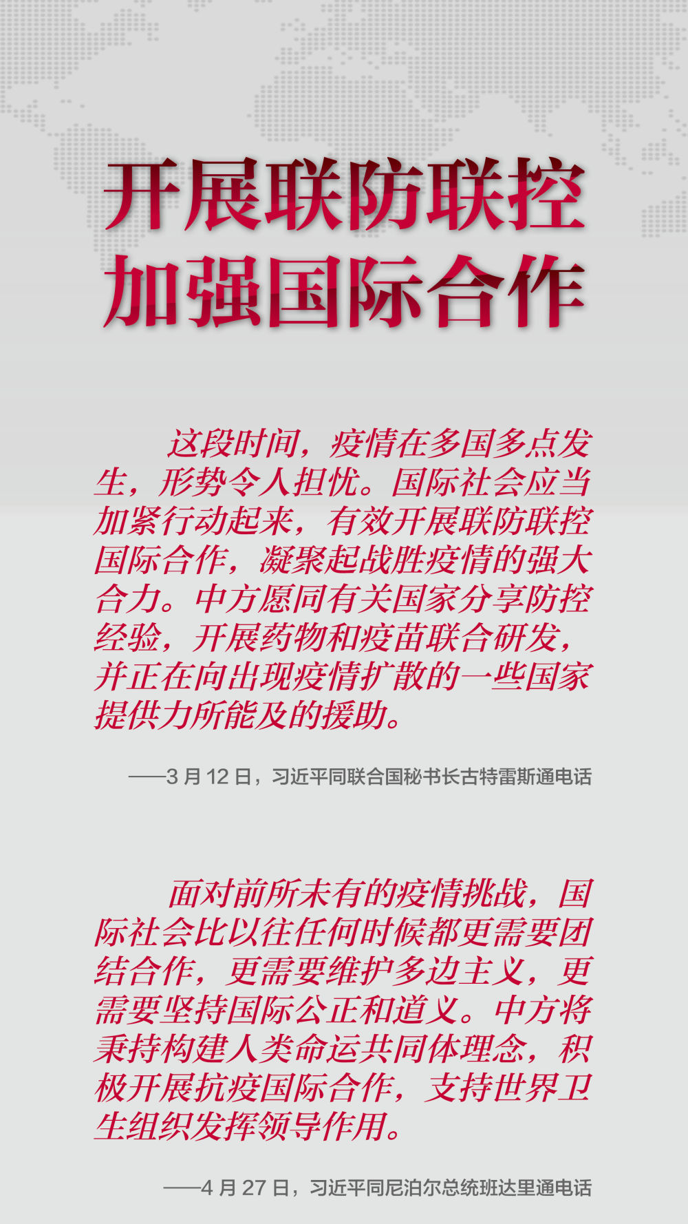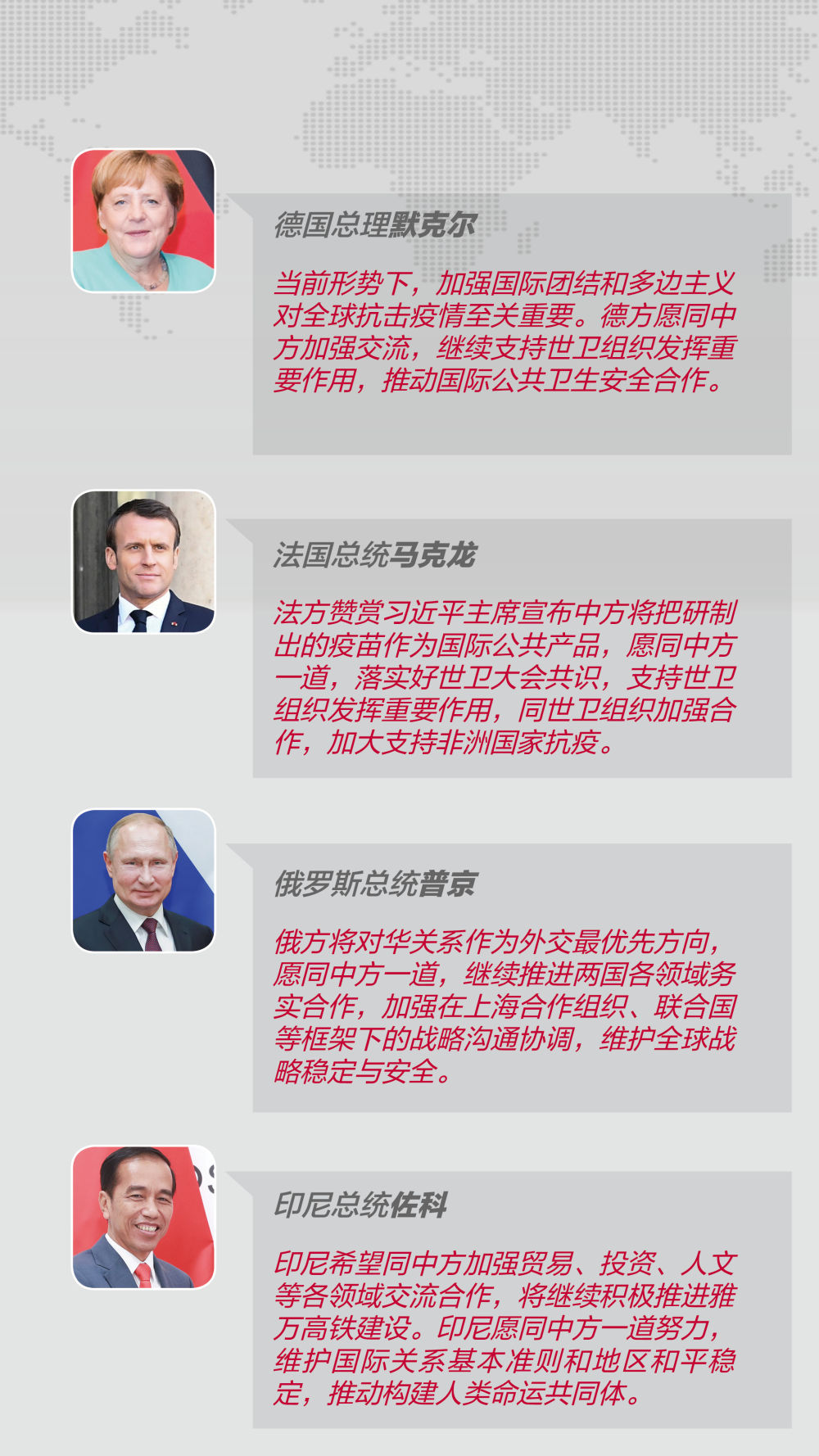 既有双边对话,也有多边会议;既有与来自亚、欧、非、北美、南美等大洲国家领导人互动,也有同国际组织负责人会见通话;既面向外国政要和国际组织,也面向外方友好人士和普通民众;既谈疫情防控,也谈传统友谊、务实合作、复工复产、“一带一路”、多边主义、全球治理等话题。