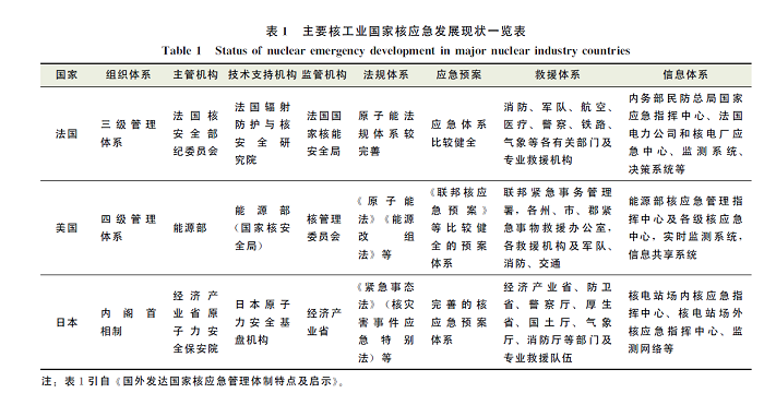 当前主要核工业国家核应急发展现状如表1所示。
