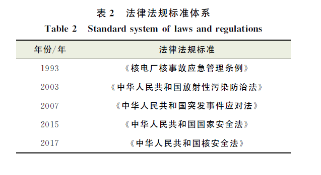 我国核应急制度建设工作在1986年切尔诺贝利核事故后得到重视。我国开始从法律层面对核应急作出规定和要求,防止及减缓辐射对生物和环境的影响。目前我国基本形成了一套完善的法律法规标准体系,如表2所示。