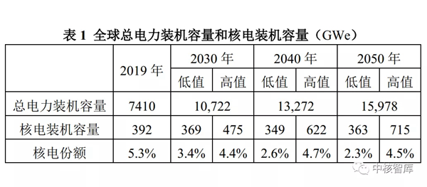 在高值情景中,核电装机容量将从2019年392 GWe增至2030年475 GWe、2040年622 GWe和2050年715 GWe。
