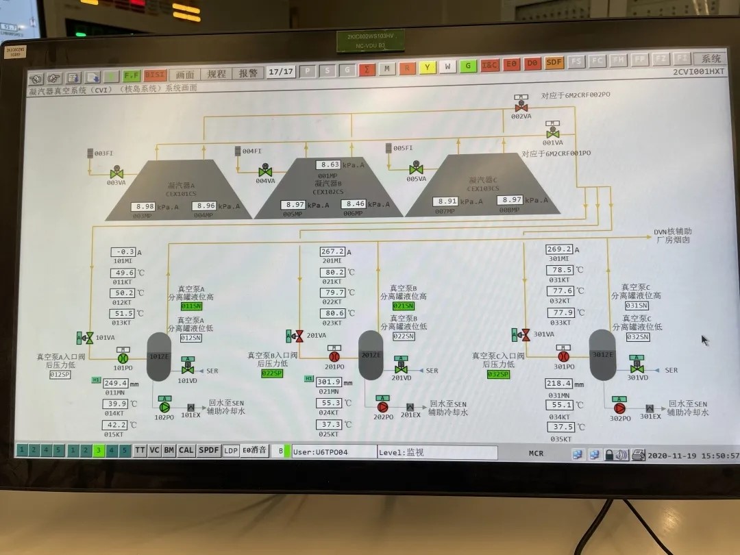 2020年11月19日下午16:08,由中核工程总包的田湾核电项目6号机组验证汽轮机投轴封工况下凝汽器汽室抽真空系统的工作性能满足设计要求,为热试期间常规岛旁路蒸汽性能试验提供了有力保证。