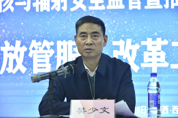 樊少文局长在大会讲话中指出:此次会议是全省生态环境系统垂管改革基本到位后召开的首次辐射安全监管领域的座谈会,对于落实生态环境部(国家核安全局)和省委省政府有关工作部署要求,提升我省核与辐射安全监管水平,助推陕西经济高质量发展具有重要意义。他强调:一是要提高政治站位,强化做好核与辐射安全监管工作的紧迫感、使命感和责任感。认真学习并深刻领会习总书记的系列重要讲话精神,牢固树立“安全第一、质量第一”理念,站在增强“四个意识”、坚定“四个自信”、做到“两个维护”的高度,充分认识做好新时代核与辐射安全监管工作的极端重要性,传承弘扬“核安全事业高于一切,核安全责任重于泰山,严慎细实规范监管,团结协作不断进取”的核安全精神,以功成不必在我,功成必定有我的精神,全力做好各项监管工作。二是要增强忧患意识,强化薄弱环节的安全监管。在看到我省核与辐射安全监管工作取得诸多成绩的同时,要清醒认识到存在的短板和弱项,全面增强忧患意识和风险意识,以如履薄冰的心态,以担当作为的豪气,齐心协力,采取强有力的措施,尽快消除工作中的短板和弱项,保障全省辐射环境安全。三是要强化能力建设,确保辐射监管领域放管服改革工作落地见效。各设区市局要切实落实辐射类项目放管服改革中“放得下、接得住、管得好、服到位”要求,保持辐射安全监管队伍稳定;加大对各级监管、执法、监测和审批人员的辐射安全法律法规、标准规范和相关业务知识培训力度;加强干部队伍的作风建设和各项工作制度建设,规范行政行为,做到依法按章办事。四是要坚持埋头苦干,狠抓各项重点工作的推进落实。在对标对表全面完成好“十三五”和今年各项重点目标任务的同时,抓紧谋划明年和“十四五”的工作,加快“十四五”规划编制,全面加强辐射类项目的事中事后监管工作,加快核安全协调机制的建立与运行,认真做好辐射安全风险隐患排查整治工作,持续强化核技术利用辐射安全监管系统数据质量提升,辐射工作人员上岗考核、伴生矿监管、邻避问题防范化解、应急管理等重点工作,确保核与辐射安全监管工作迈上新台阶,全力推进监管体系和监管能力两个现代化建设,奋力谱写新时代陕西核与辐射安全监管工作新篇章。