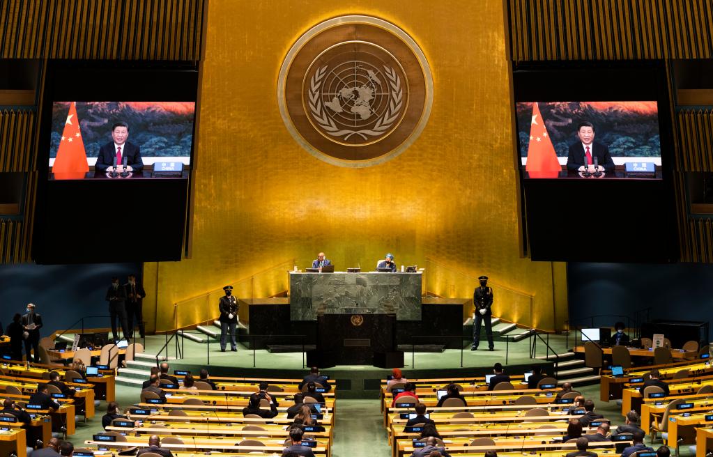 2021年9月21日,习近平在北京以视频方式出席第七十六届联合国大会一般性辩论并发表重要讲话。新华社记者王迎摄