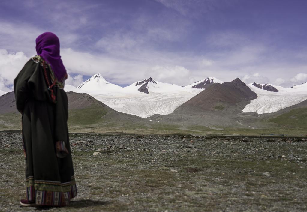 2020年8月15日,在青海省玉树藏族自治州,牧民在雪山脚下远眺岗加曲巴冰川。新华社记者吴刚摄