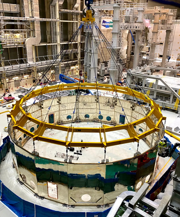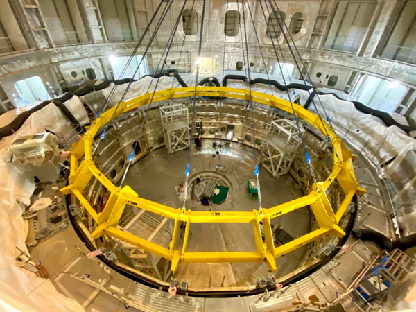 当地时间1月14日,在法国南部卡达拉舍,国际热核聚变实验堆(ITER)托卡马克装置第三个重大部件——杜瓦下部冷屏成功落位至杜瓦底座内侧上方,吊装工作圆满完成。杜瓦下部冷屏吊装是ITER计划重大工程安装启动仪式后的第二个重大部件安装,也是中核集团中国核电工程有限公司牵头的中法联合体在法国完成的2021年第一个重大节点和重大安装任务,为ITER计划的顺利推进再次贡献中国智慧和中国力量,体现了中国恪守国际承诺的责任担当。