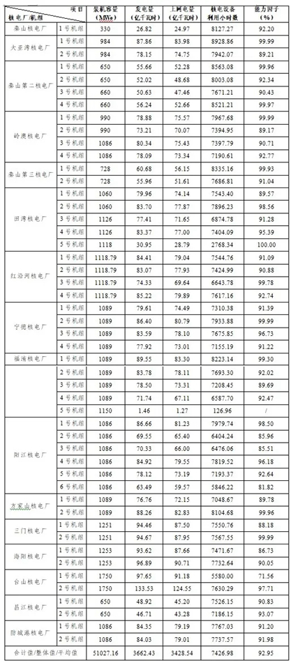 (2)关于本表最后一行的“合计值/整体值/平均值”,装机容量、发电量、上网电量为各机组合计值,核电设备利用小时数为全部机组整体值,能力因子为全部机组的算数平均值。
