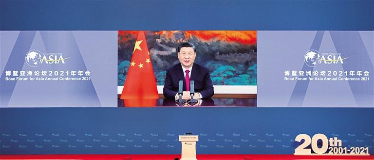 4月20日上午,博鳌亚洲论坛2021年年会开幕式在海南博鳌举行,国家主席习近平以视频方式发表题为《同舟共济克时艰,命运与共创未来》的主旨演讲。 新华社记者 鞠鹏摄