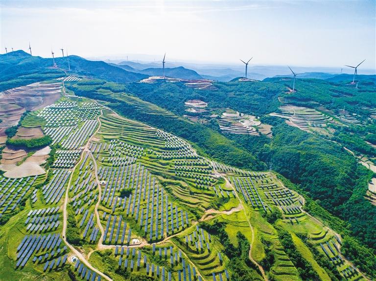 6月2日,航拍位于铜川市宜君县哭泉镇云梦乡一带的光伏、风力发电机组。今年以来,仅铜川市峡光新能源发电有限公司刘家埝光伏电站发电量就超过1.5亿千瓦时。本报记者 袁景智摄
