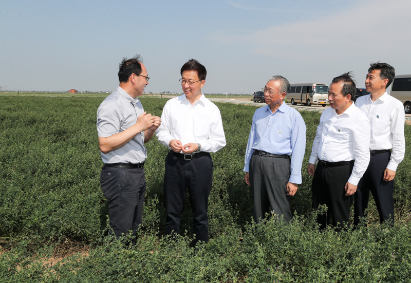 7月5日至6日,中共中央政治局常委、国务院副总理韩正先后在山东东营、济南调研。这是7月5日,韩正在黄河三角洲现代农业技术创新中心考察盐碱地生态保护和综合利用情况。新华社记者 姚大伟 摄