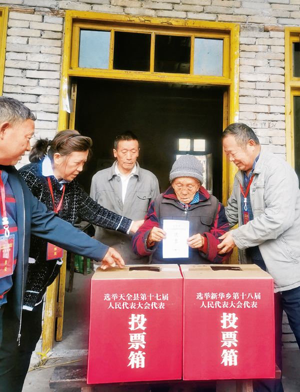 从2021年上半年起,全国县乡两级人大换届选举陆续展开。就在中央人大工作会议结束后的第二天(10月15日上午),四川省雅安市天全县新华乡永安村8组的106岁老人李朝兰,迎来了她人生中的第18次换届选举投票——这一天,她依法行使自己的权利,为产生新一届县乡两级人大代表投出宝贵一票。图为李朝兰老人郑重投出选票。 全国人大常委会供图 杨爱玲/摄