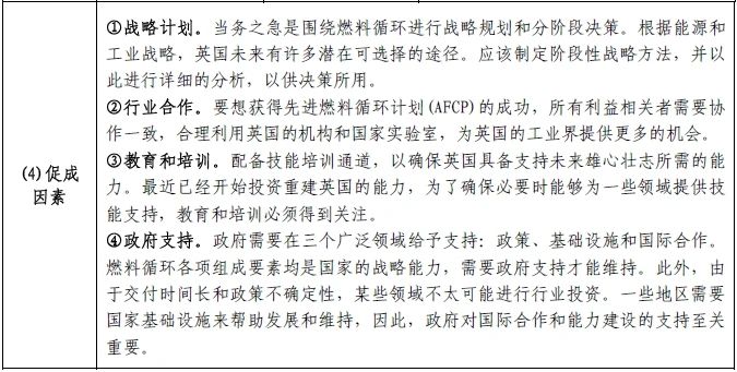 ④促成因素包括模拟燃料的制造能力、参与国际合作和热示范基础设施的使用。
