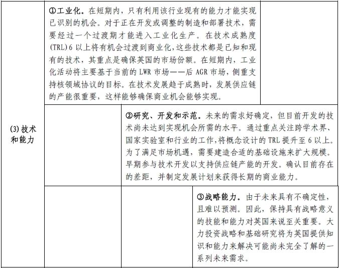 表2列出了英国先进核燃料及核燃料循环的关键机会领域,这些机会领域构成了路线图的基础,包括:①先进核燃料路线图中的先进技术燃料(ATF)、包覆颗粒燃料(CPF)和快堆燃料和燃料循环;②可持续先进燃料循环路线图中用以生产未来燃料的轻水堆(LWR)燃料先进再循环技术、ATF先进再循环技术和高温化学(熔盐)再循环技术。