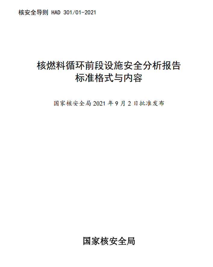 为进一步完善我国核与辐射安全法规体系,我局组织修订了核安全导则《铀燃料加工设施安全分析报告的标准格式与内容》(HAD301/01-1991),并将导则名称修改为《核燃料循环前段设施安全分析报告标准格式与内容》(HAD301/01-2021)。现予公布,自公布之日起实施。导则内容可在生态环境部网站(http://www.mee.gov.cn)查询。