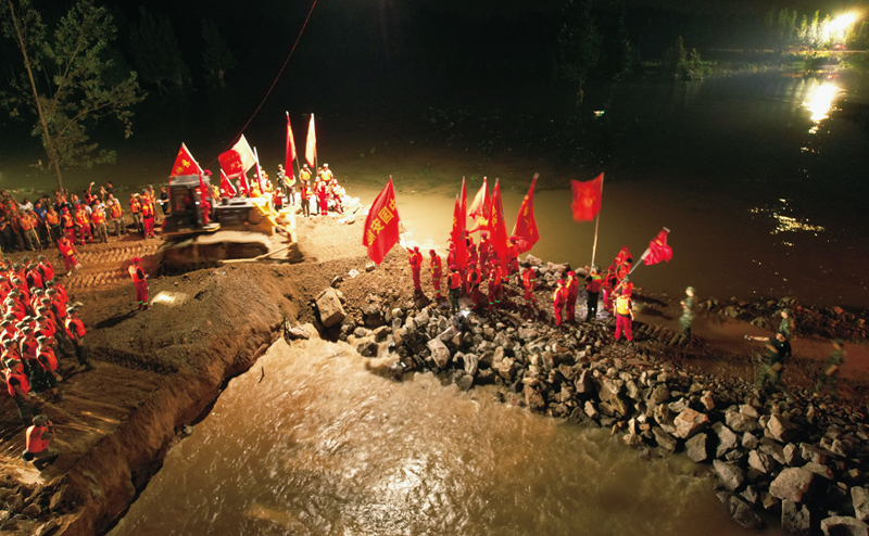 2021年7月17日至23日,河南持续遭遇极端强降雨天气。7月22日,鹤壁市浚县新镇镇彭村段卫河大堤发生决口。前来救援的中国安能集团在抢险一线成立4个党小组,分别负责现场指挥、决口封堵、裹头加固、综合保障工作。在党小组的组织下,现场169名救援人员汇聚成冲不垮的“红色堤坝”,经过70多个小时的艰苦奋战,终于使卫河大堤决口合龙。这是2021年7月26日凌晨决口成功合龙后,救援人员在大堤上挥舞红旗(无人机照片)。 新华社发 张小明/摄