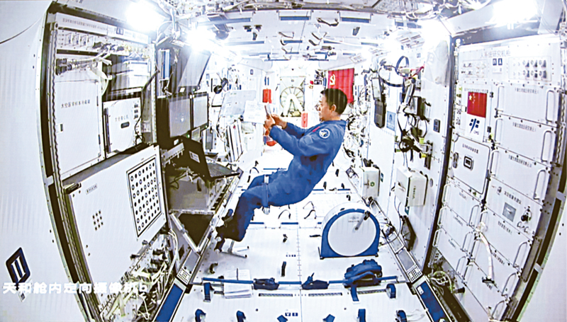 2021年6月17日,神舟十二号载人飞船发射升空。飞船搭载了一面党旗,这面党旗在中国共产党成立100周年之际进入中国空间站内,经历了我国空间站阶段首次载人飞行任务取得圆满成功的全过程。图为2021年7月4日,在北京航天飞行控制中心大屏拍摄的天和核心舱内航天员聂海胜配合支持两名出舱航天员开展舱外操作。 新华社记者 金立旺/摄