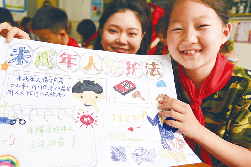 2021年6月16日,在江苏省镇江市南徐小学,一名小学生在展示江苏大学法律援助中心志愿者指导绘制的《未成年人保护法》主题手抄报。 视觉中国供图