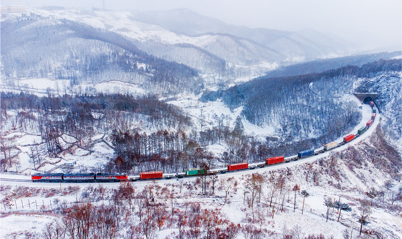 中欧班列已实现月行千列、年行万列,成为贯穿欧亚大陆的国际贸易“大动脉”。2021年1月至11月,中欧班列开行约1.4万列、同比增长20.3%。图为2021年12月17日,从绥芬河口岸出发的中欧班列在林海雪原中穿梭。 曲艺伟/摄
