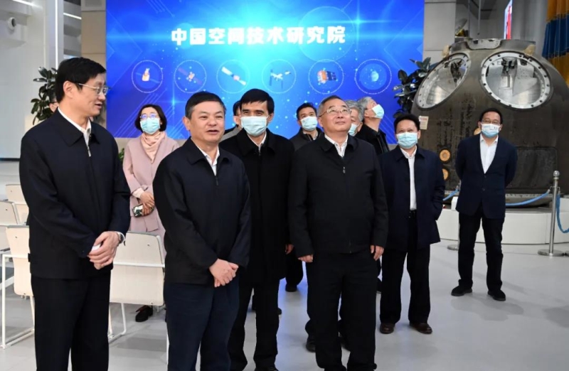 黄润秋一行首先参观调研了中国空间技术研究院展示中心、卫星总装车间,仔细了解中国航天事业发展成就,就航天科技在生态环境领域的应用进行了深入交流。