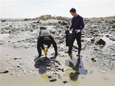 图为采样人员正在采集海阳核电厂排放口附近潮间带土壤样品。姜孟摄
