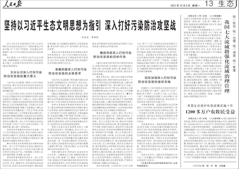 2.生态环境部党组书记孙金龙、部长黄润秋在《人民日报》发表署名文章《坚持以习近平生态文明思想为指引 深入打好污染防治攻坚战》