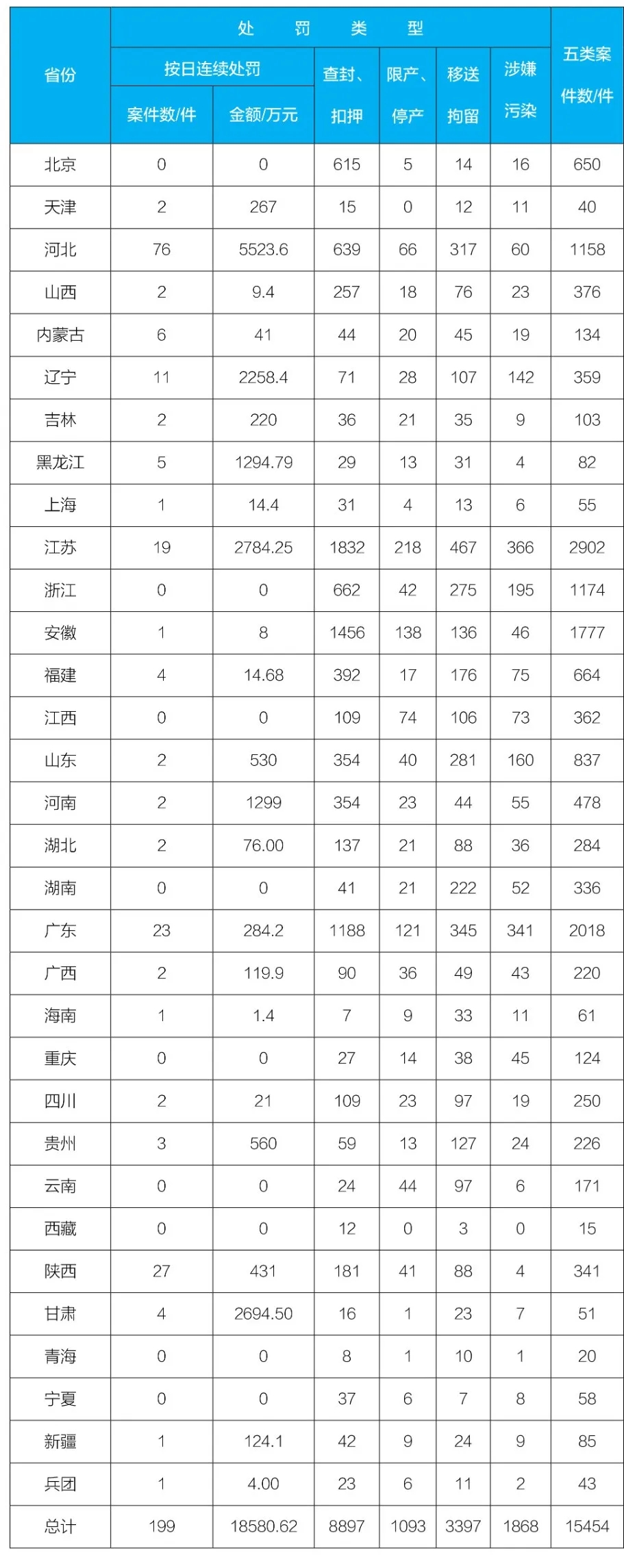 2021年1-12月,全国五类案件总数为15454件。其中,按日连续处罚案件数量为199件,罚款金额为18580.62万元;适用查封、扣押案件数量为8897件;适用限产、停产案件数量为1093件;移送拘留案件数量为3397件;移送涉嫌环境污染犯罪案件数量为1868件。