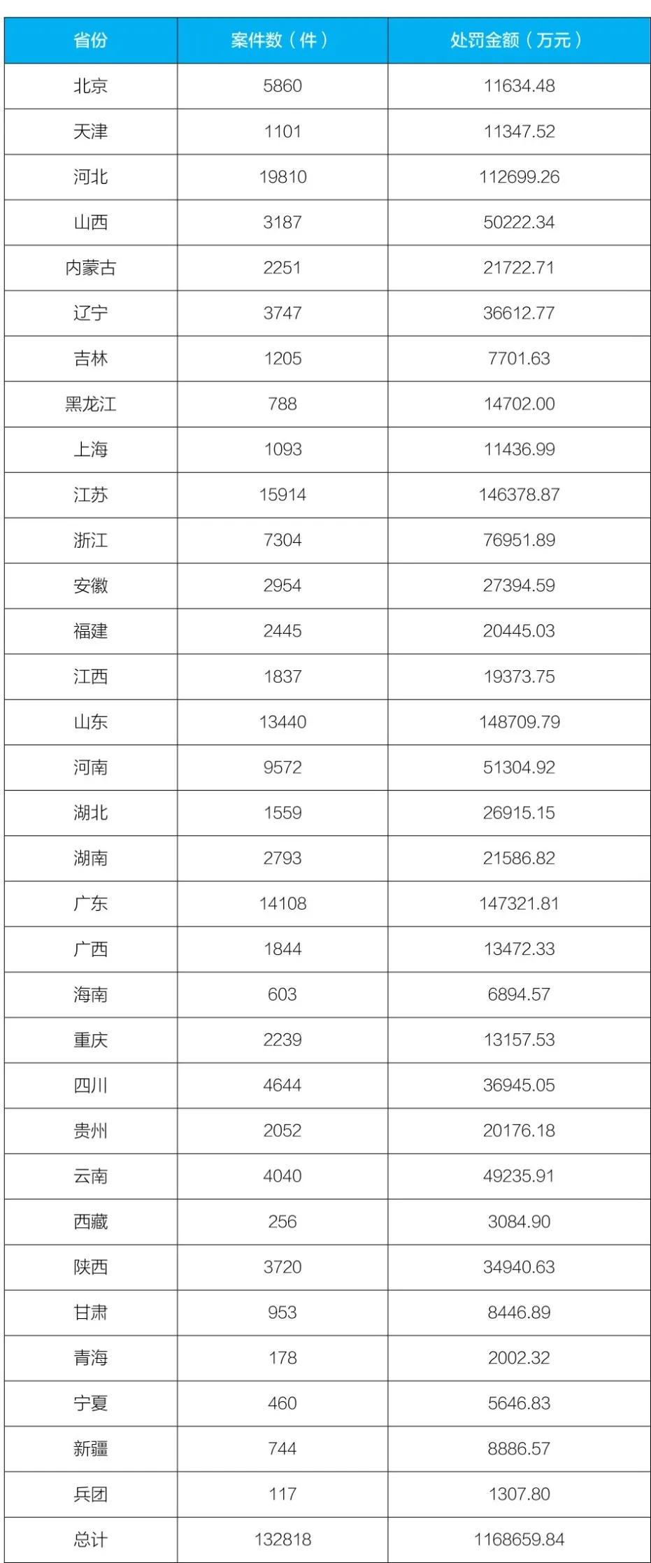 行政处罚案件数量排名前五的省份为:河北、江苏、广东、山东、河南。罚款金额排名前五的省份为:山东、广东、江苏、河北、浙江。