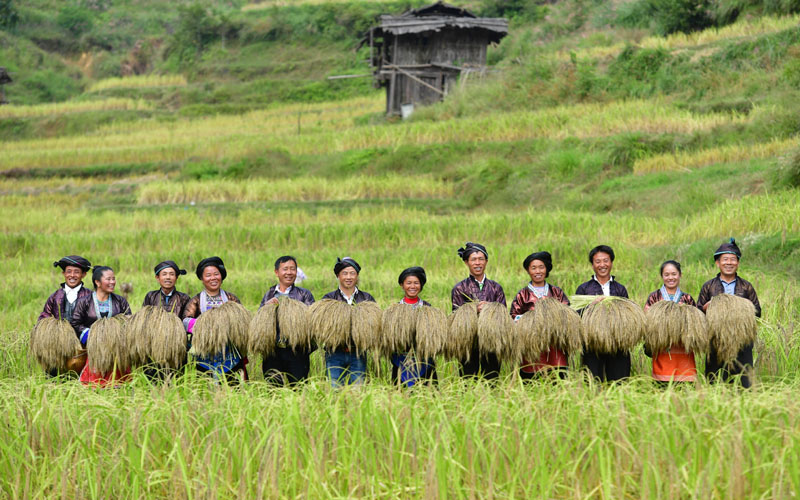在广西融水苗族自治县良寨乡大里村,村民们展示刚刚收割的脱贫特色产品——紫黑香糯(2018年10月12日摄)。新华社记者 黄孝邦 摄