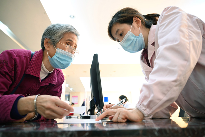 福建省三明市第一医院的医保办工作人员(右)向前来咨询药品报销问题的居民讲解相关政策(2020年11月18日摄)。新华社记者 姜克红 摄