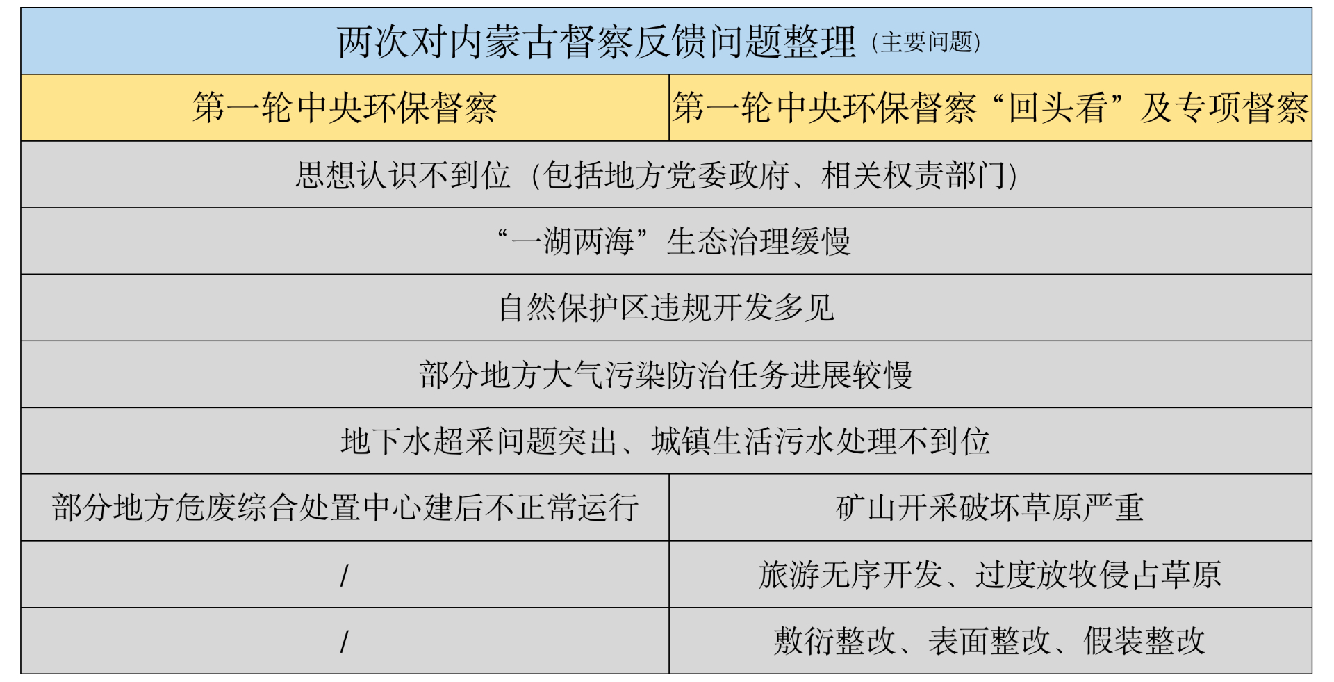 第一轮首批,到第二轮末批,5年间,内蒙古对生态环境整改采取的行动值得关注。首先通过一个表格来看看历次督察反馈意见中列出的问题。